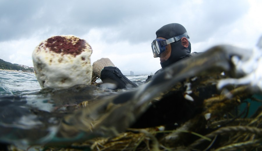 A staff member collects wastes in the sea area of Wuzhizhou Island of Sanya, south China's Hainan Province, Sept. 14, 2021. (Xinhua/Yang Guanyu)