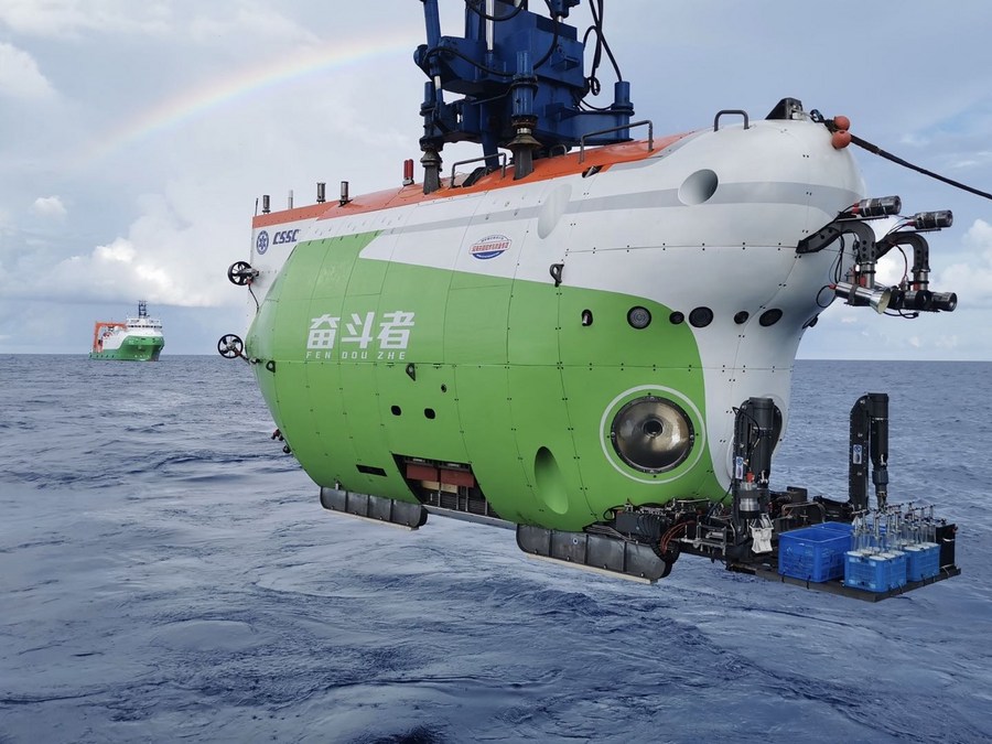 Undated file photo shows China's deep-sea manned submersible Fendouzhe (Striver). The manned submersible Fendouzhe, setting a national record by diving to a depth of 10,909 meters in the Mariana Trench during an expedition, returned to south China's Hainan Province on Nov. 28, 2020. (China State Shipbuilding Corporation /Handout via Xinhua)■