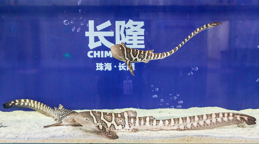 Photo taken on July 13, 2021 shows the three zebra sharks at the Chimelong Ocean Kingdom in Zhuhai, south China's Guangdong Province. Three endangered species of zebra sharks have been successfully bred by the theme park Chimelong Ocean Kingdom in Zhuhai, south China's Guangdong Province, in the first half of 2021. (Xinhua/Huang Guobao)