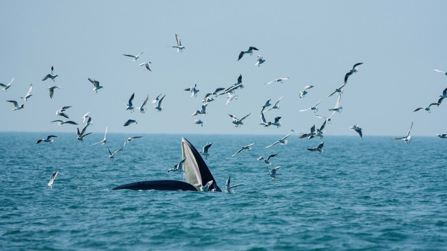 A Bryde's whale forages in waters off Weizhou Island in south China's Guangxi Zhuang Autonomous Region, Jan. 15, 2021. A scientific research team, composed of scientists, videographers, fishermen, and volunteers, has been conducting research on the whales and taking the role of the guardians of these marine mammals since they were first discovered in waters off Weizhou Island in 2016. (Xinhua/Liu Jinhai)