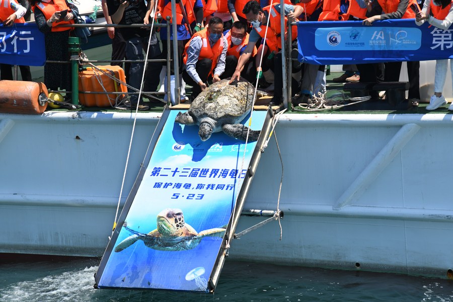 Staff members release a sea turtle on the occasion of World Turtle Day in Qingdao, east China's Shandong Province, May 23, 2022. (Xinhua/Li Ziheng)