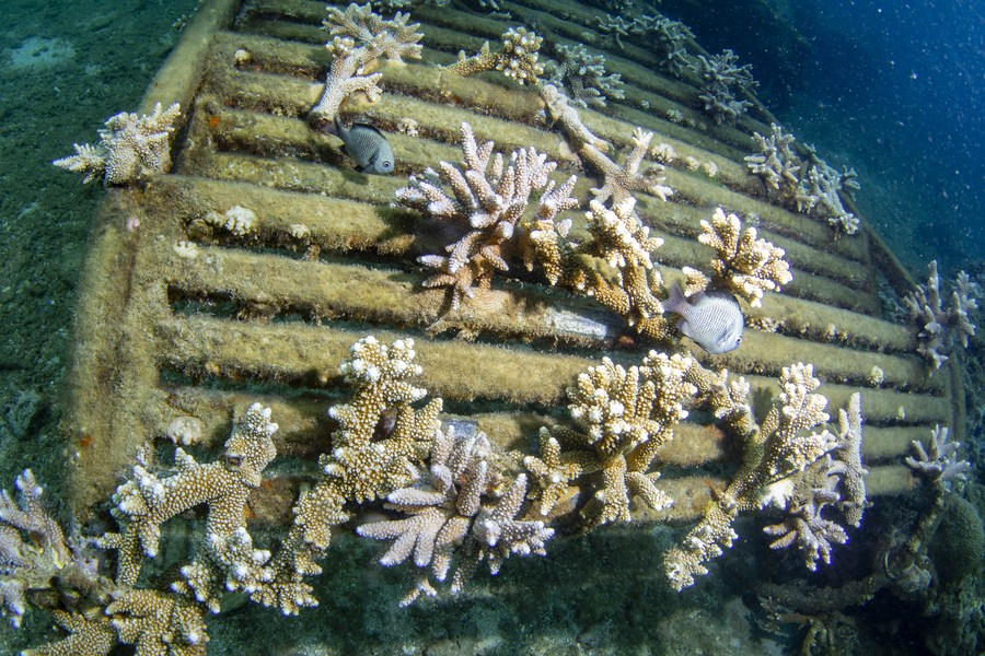 Photo taken on June 8, 2022 shows planted corals in the waters of Fenjiezhou Island of Hainan Province, south China. (Xinhua/Zhang Liyun)