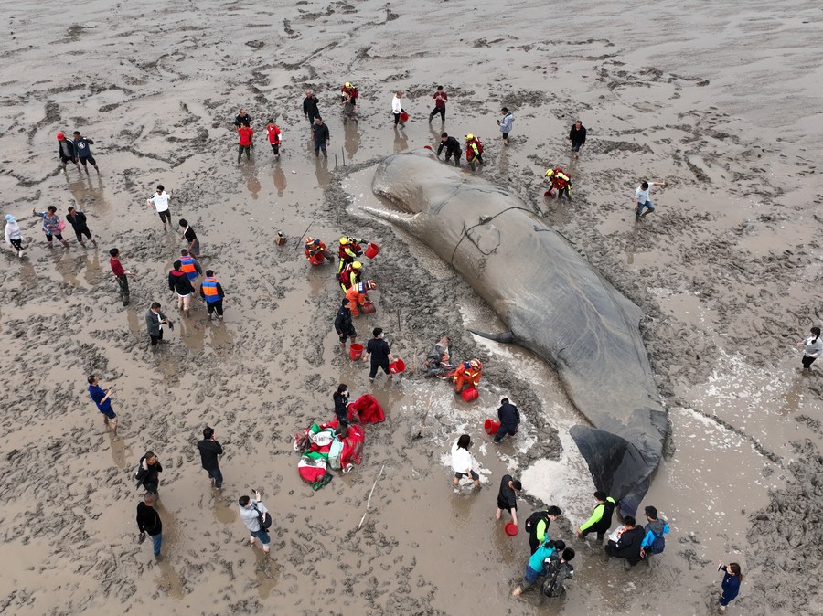 Aerial photo shows rescuers helping a stranded whale in Xiangshan County of Ningbo, east China's Zhejiang Province, April 19, 2022. (Xinhua)