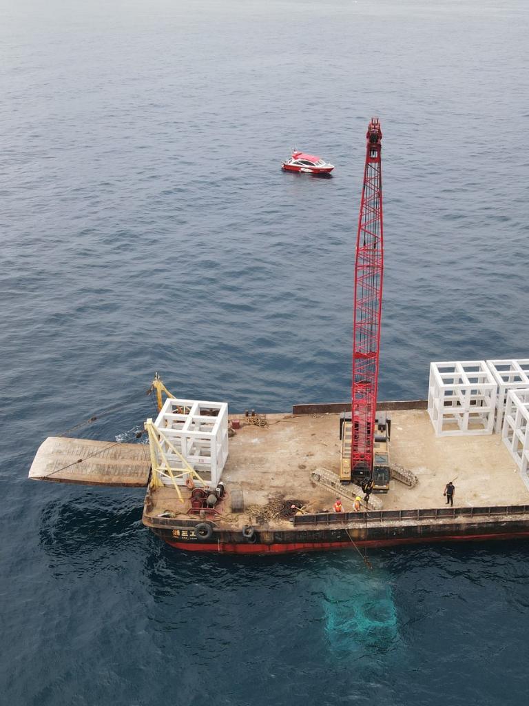 In this aerial photo taken on April 1, 2021, staff lay artificial reefs around Wuzhizhou Island in Sanya City, south China's Hainan Province. Wuzhizhou Island has launched a comprehensive drive to build a marine ranch and restore the marine ecosystem, by placing artificial reefs under the sea and transplanting corals. By the end of 2020, Wuzhizhou Island marine ranch has placed 1,526 artificial reefs. And 870 more will be laid within a month in the recent artificial reefs placement. (Xinhua/Zhang Liyun)