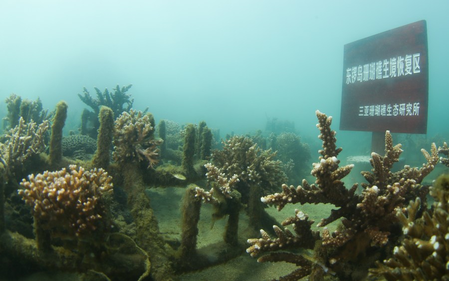 Photo taken on March 18, 2021 shows an area for coral restoration near Dongluo Island in Yazhou Bay of Sanya, south China's Hainan Province. The ecological restoration demonstration in Yazhou Bay has achieved initial effects. The project is proposed based on the urgent need for the restoration of the Hainan coastal ecosystem. Researchers carry out systematic ecological restoration activities for the coral reef ecosystem around Dongluo Island. Thanks to researchers' work, the survival rate of coral has reached more than 70 percent. And the coral coverage rate has increased by 10 percent. (Xinhua/Yang Guanyu)