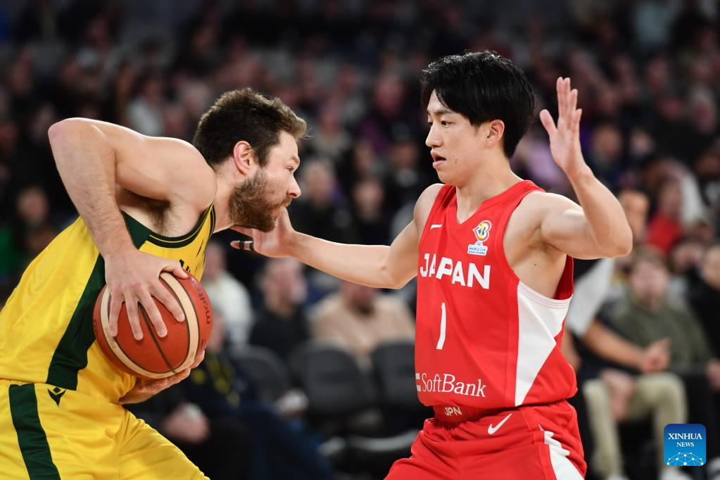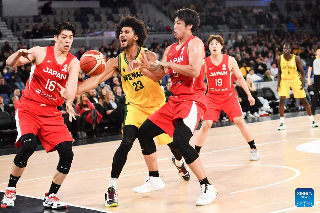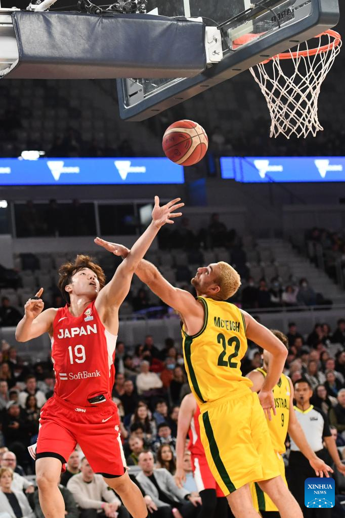 Keanu Pinder (2nd L) of Australia competes during a Group B match between Japan and Australia of Basketball World Cup Asian Qualifiers in Melbourne, Australia, July 1, 2022. (Photo by Bai Xue/Xinhua)
