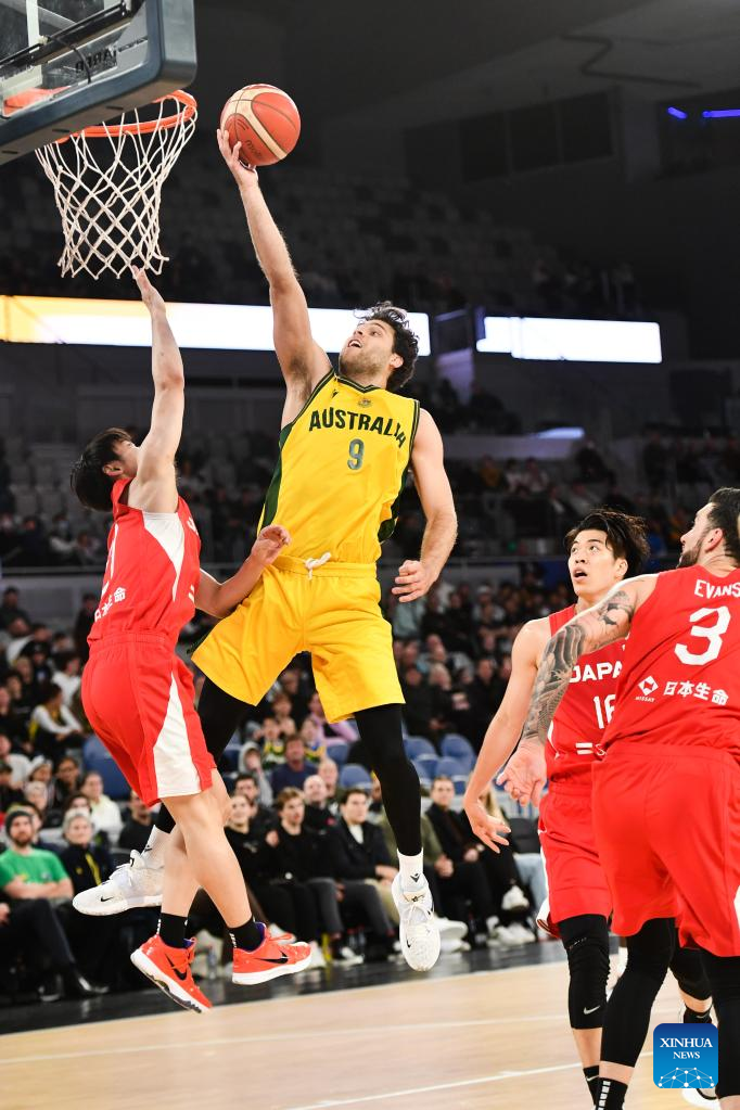 William McDowell-White (2nd L) of Australia lays the ball up during a Group B match between Japan and Australia of Basketball World Cup Asian Qualifiers in Melbourne, Australia, July 1, 2022. (Photo by Bai Xue/Xinhua)