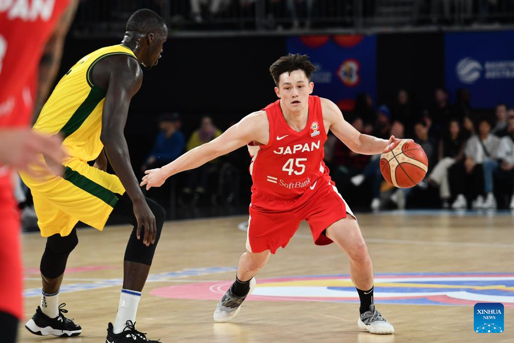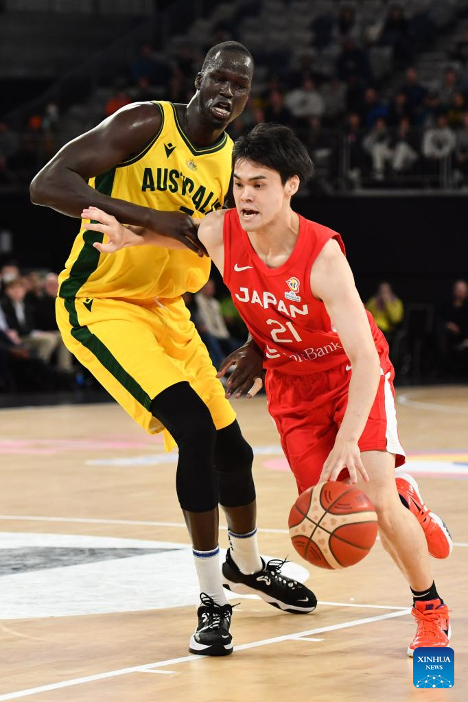 Toews Kai (R) of Japan competes during a Group B match between Japan and Australia of Basketball World Cup Asian Qualifiers in Melbourne, Australia, July 1, 2022. (Photo by Bai Xue/Xinhua)
