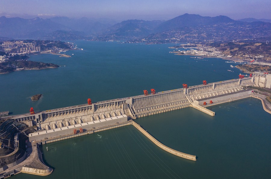 Aerial photo taken on Jan. 1, 2021 shows the Three Gorges Dam in central China's Hubei Province. (Photo by Xiang Hongmei/Xinhua)■