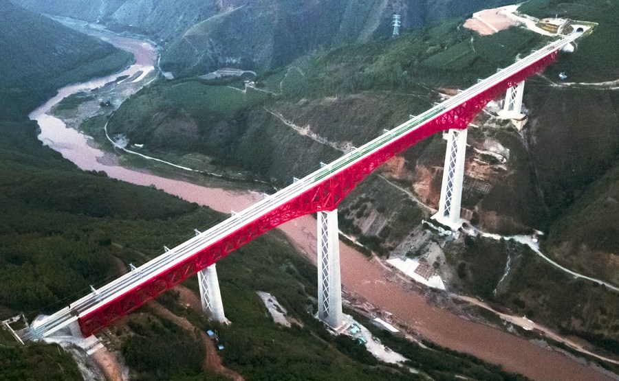 Aerial photo shows an electric multiple unit (EMU) train of the China-Laos Railway crossing a major bridge over the Yuanjiang River in southwest China's Yunnan Province, Dec. 3, 2021. (Xinhua/Wang Guansen)
