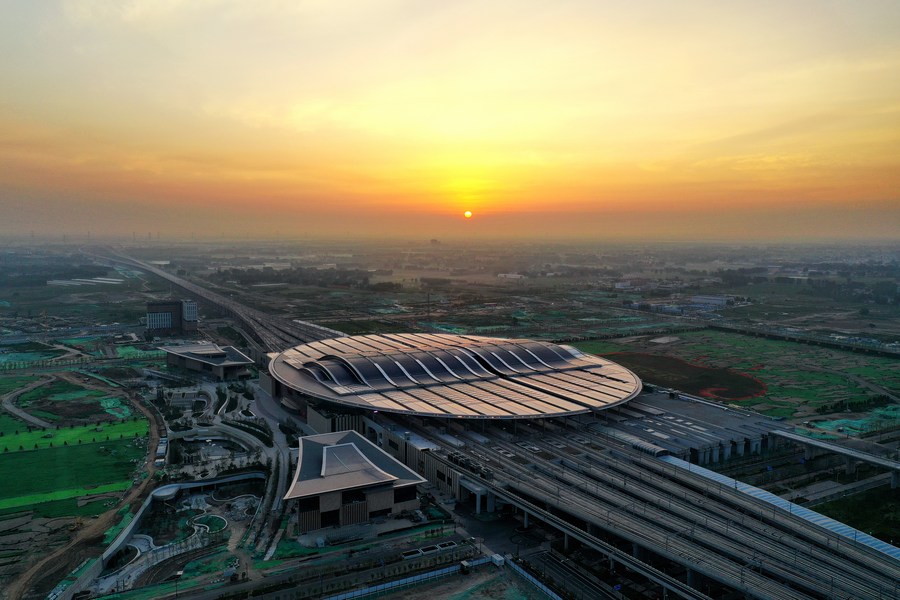 Aerial photo taken on July 1, 2021 shows the Xiong'an Railway Station at sunrise in Xiong'an New Area, north China's Hebei Province. (Xinhua/Mu Yu)