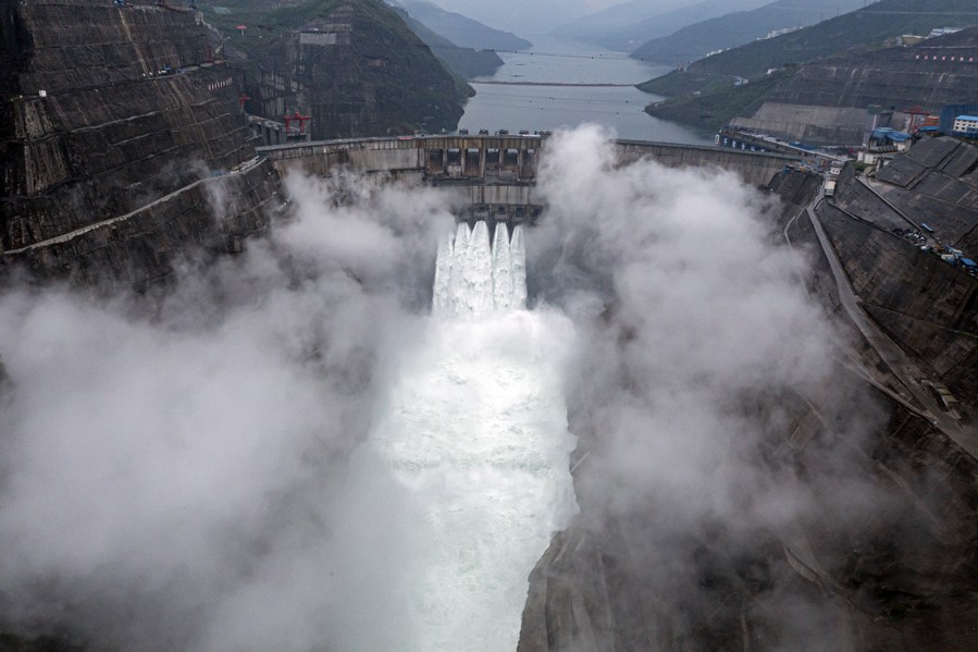 Aerial photo taken on July 1, 2021 shows the Baihetan hydropower station in southwest China. (Xinhua/Jiang Wenyao)