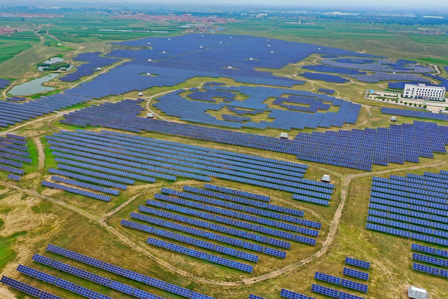 Aerial photo taken on Aug. 3, 2021 shows a photovoltaic power station in Tujing Village, Yunzhou District of Datong City, north China's Shanxi Province. The photovoltaic power station, built upon 1,851 mu (123.4 hectares) of saline-alkaline land, generates over 80 million KWH of power per year. (Xinhua/Cao Yang)