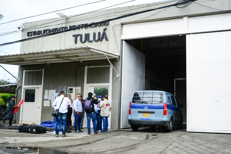 People wait outside a prison that caught fire, in the town of Tulua, in Valle del Cauca department, Colombia, on June 28, 2022. (Xinhua/Str)