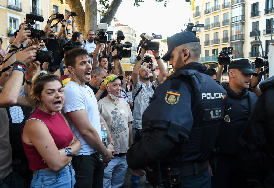 Police stand guard as demonstrators protest against the North Atlantic Treaty Organization (NATO) summit in the square of Tirso de Molina in Madrid, Spain, June 29, 2022. (Photo by Gustavo Valiente/Xinhua)