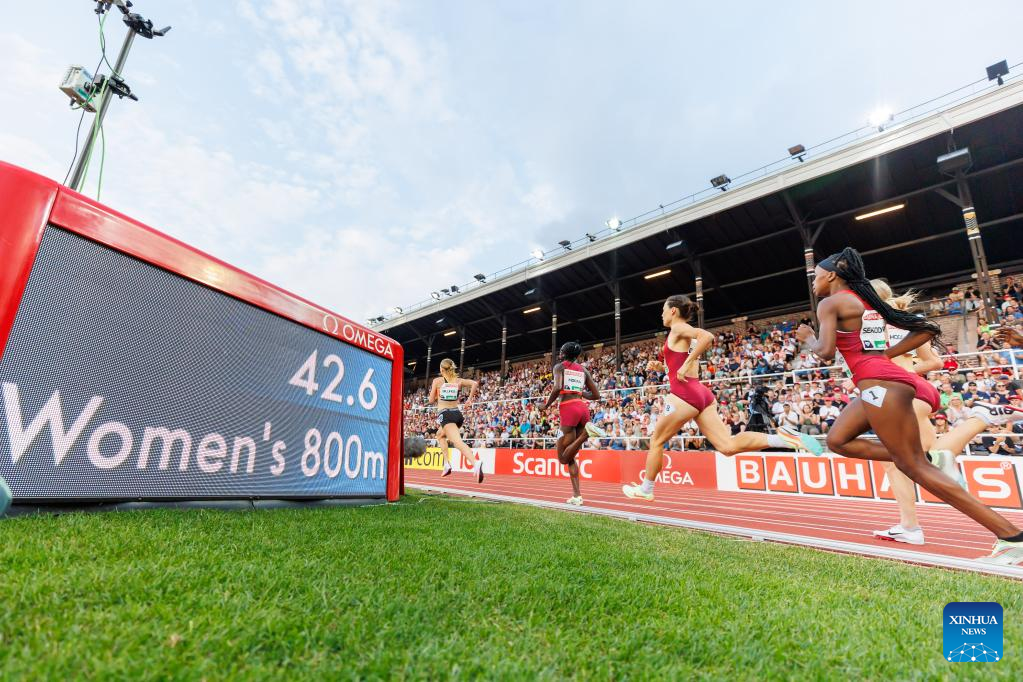 Athletes compete during women's 800m at the Diamond League athletics meeting in Stockholm, Sweden, June 30, 2022. (Photo by Wei Xuechao/Xinhua)