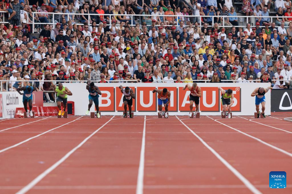 Athletes compete during men's 100m at the Diamond League athletics meeting in Stockholm, Sweden, June 30, 2022. (Photo by Wei Xuechao/Xinhua)