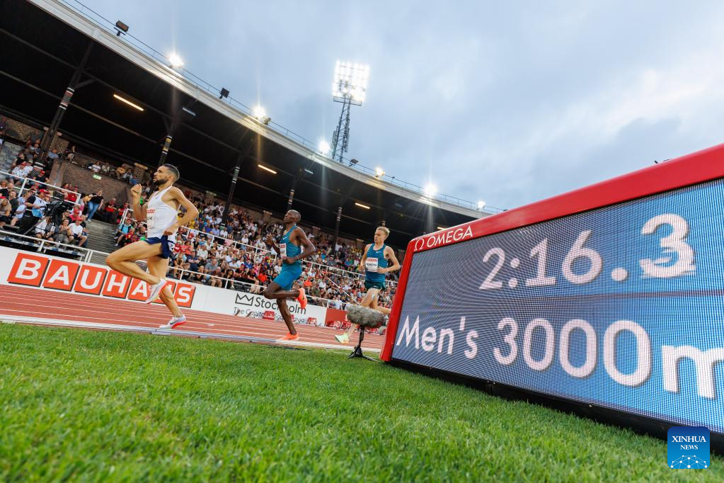 Athletes compete during men's 3000m at the Diamond League athletics meeting in Stockholm, Sweden, June 30, 2022. (Photo by Wei Xuechao/Xinhua)