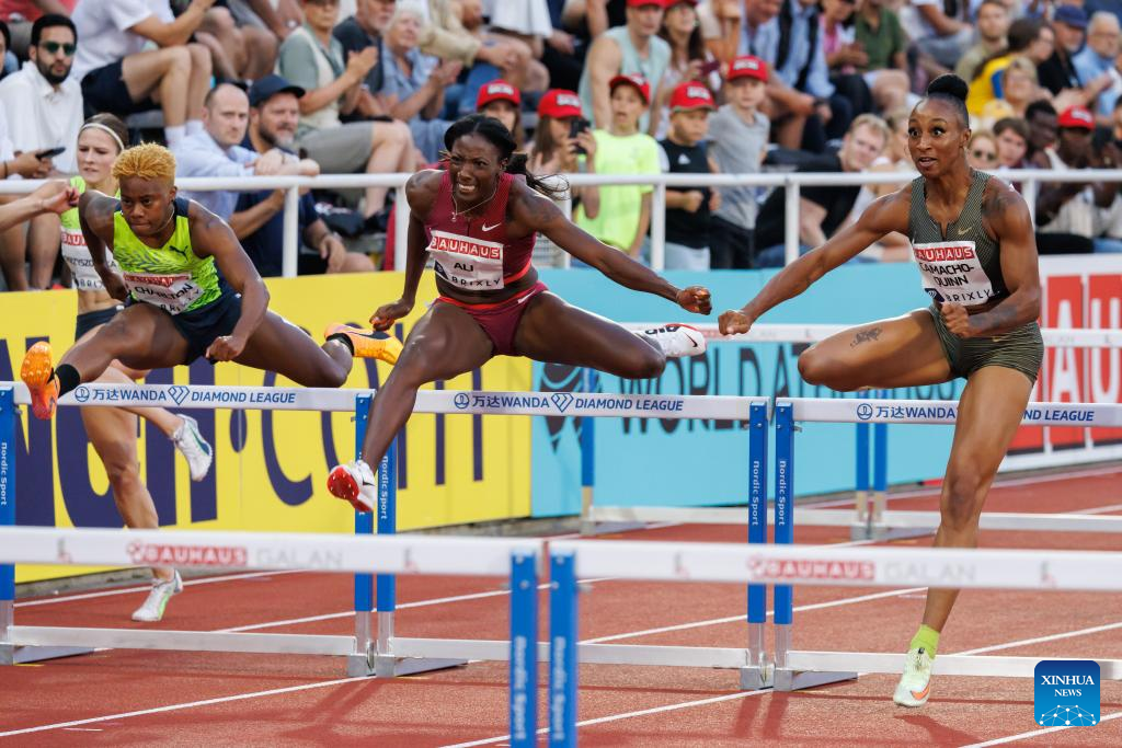 Puerto Rico's Jasmine Camacho-Quinn (R) competes during women's 100m hurdles at the Diamond League athletics meeting in Stockholm, Sweden, June 30, 2022. (Photo by Wei Xuechao/Xinhua)