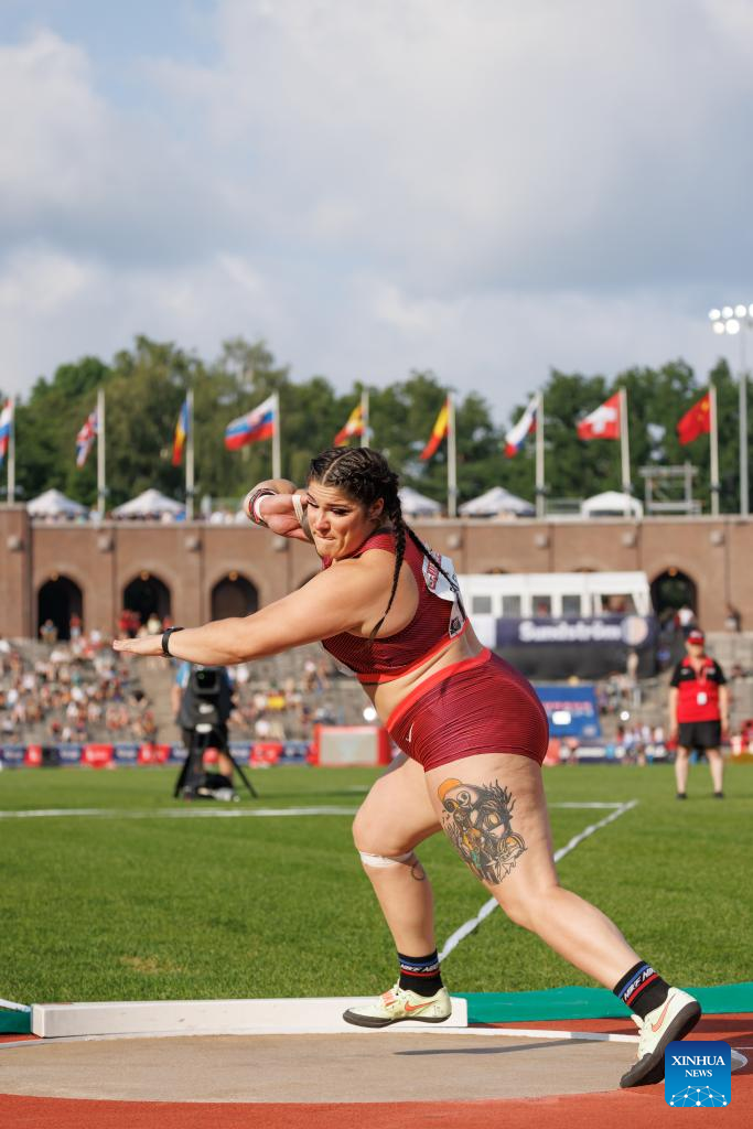 The United States' Chase Ealey competes during women's shot put at the Diamond League athletics meeting in Stockholm, Sweden, June 30, 2022. (Photo by Wei Xuechao/Xinhua)