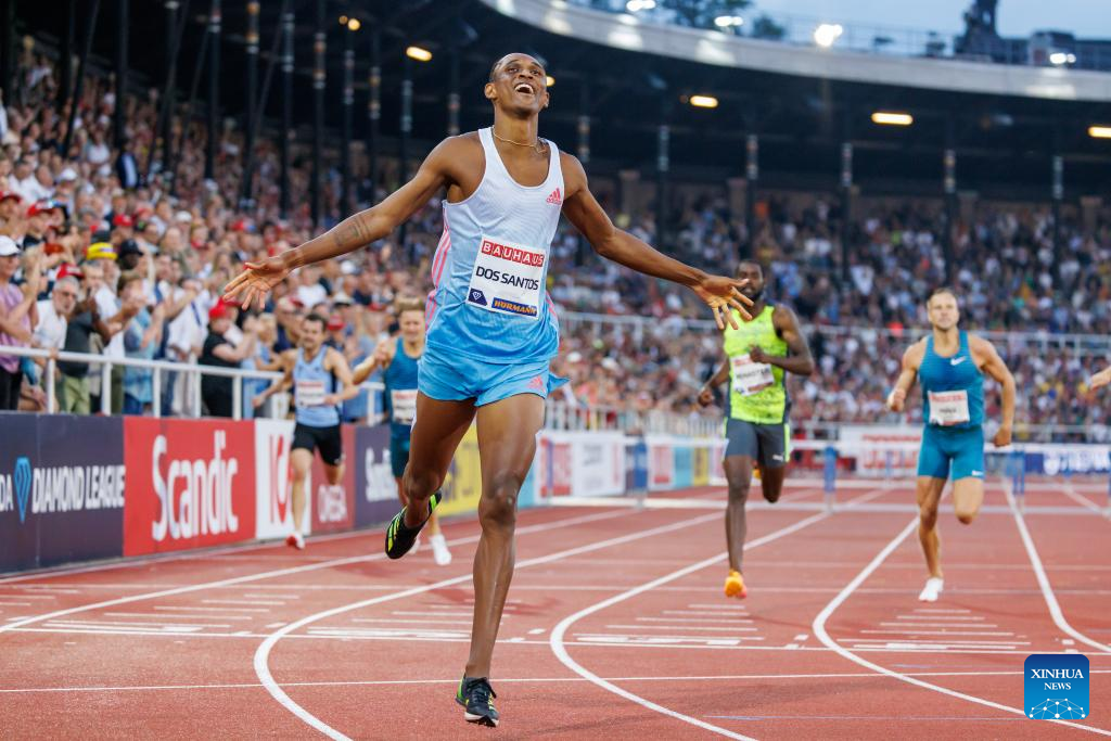 Brazil's Alison dos Santos celebrates winning men's 400m hurdles at the Diamond League athletics meeting in Stockholm, Sweden, June 30, 2022. (Photo by Wei Xuechao/Xinhua)