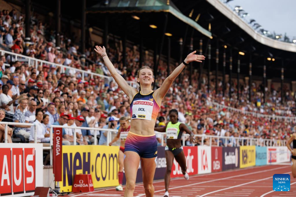Femke Bol of the Netherlands celebrates winning women's 400m hurdles at the Diamond League athletics meeting in Stockholm, Sweden, June 30, 2022. (Photo by Wei Xuechao/Xinhua)