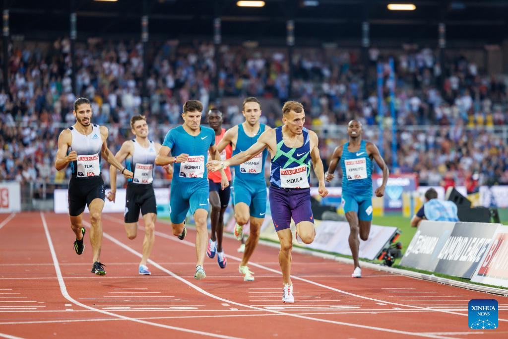 Algeria's Slimane Moula (front) competes during men's 800m at the Diamond League athletics meeting in Stockholm, Sweden, June 30, 2022. (Photo by Wei Xuechao/Xinhua)