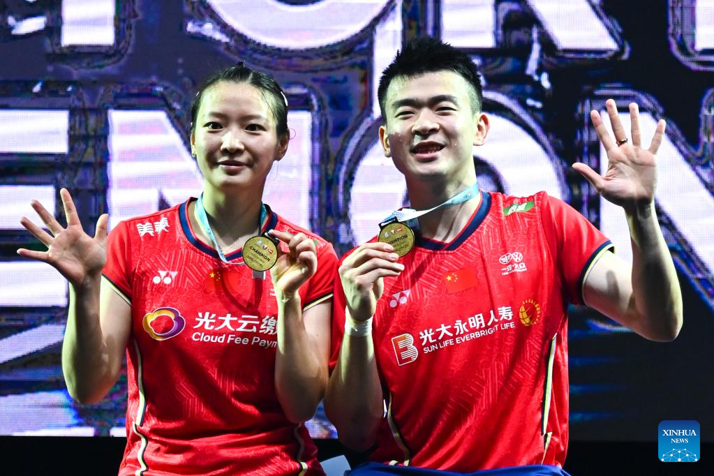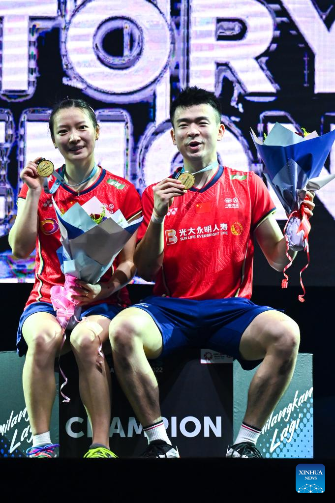 Huang Yaqiong (L) and Zheng Siwei pose during the medal ceremony for the mixed doubles match at Malaysia Open 2022 badminton tournament in Kuala Lumpur, Malaysia, July 3, 2022. (Xinhua/Zhu Wei)