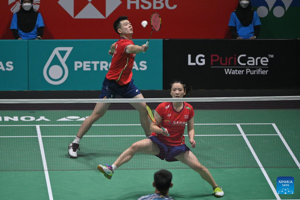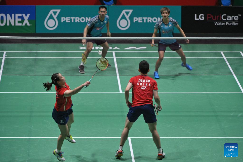 Zheng Siwei/Huang Yaqiong(front) compete during the mixed doubles final match between Zheng Siwei/Huang Yaqiong of China and Dechapol Puavaranukroh/Sapsiree Taerattanachai of Thailand at Malaysia Open 2022 badminton tournament in Kuala Lumpur, Malaysia, July 3, 2022. (Photo by Chong Voon Chung/Xinhua)