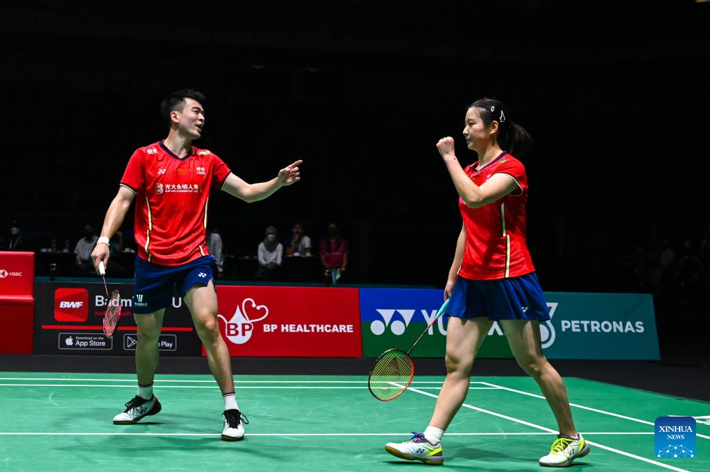 Zheng Siwei(L)/Huang Yaqiong celebrate scoring during the mixed doubles final match between Zheng Siwei/Huang Yaqiong of China and Dechapol Puavaranukroh/Sapsiree Taerattanachai of Thailand at Malaysia Open 2022 badminton tournament in Kuala Lumpur, Malaysia, July 3, 2022. (Xinhua/Zhu Wei)