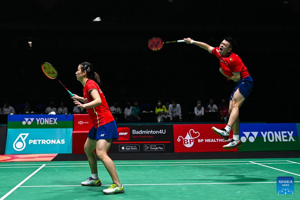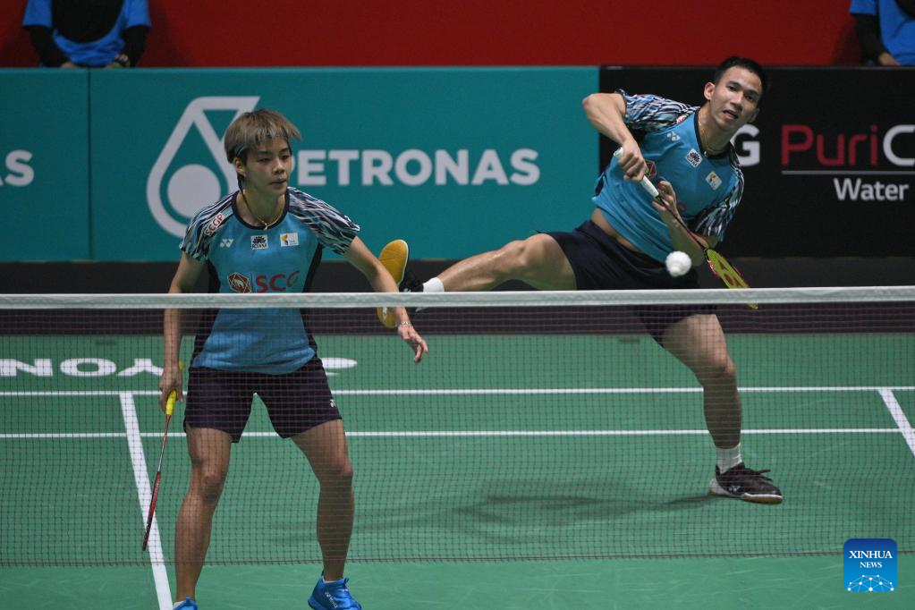 Dechapol Puavaranukroh (R)/Sapsiree Taerattanachai compete during the mixed doubles final match between Zheng Siwei/Huang Yaqiong of China and Dechapol Puavaranukroh/Sapsiree Taerattanachai of Thailand at Malaysia Open 2022 badminton tournament in Kuala Lumpur, Malaysia, July 3, 2022. (Photo by Chong Voon Chung/Xinhua)