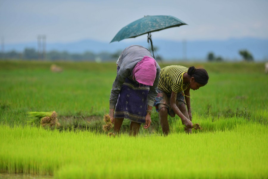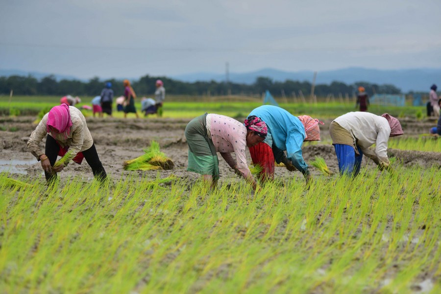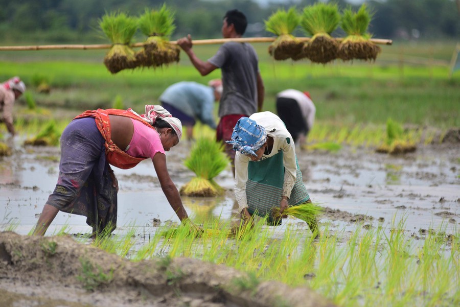 Women plant rice saplings at a paddy field in Nagaon district of India's northeastern state of Assam, July 3, 2022. (Str/Xinhua)