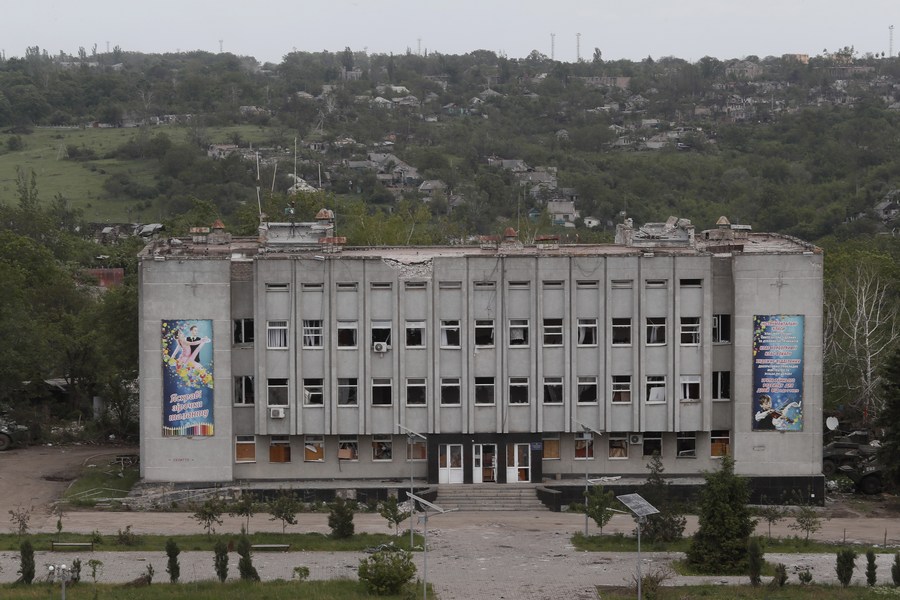 Photo taken on May 26, 2022 shows a view of damaged constructions in Popasna of Lugansk. (Photo by Victor/Xinhua)