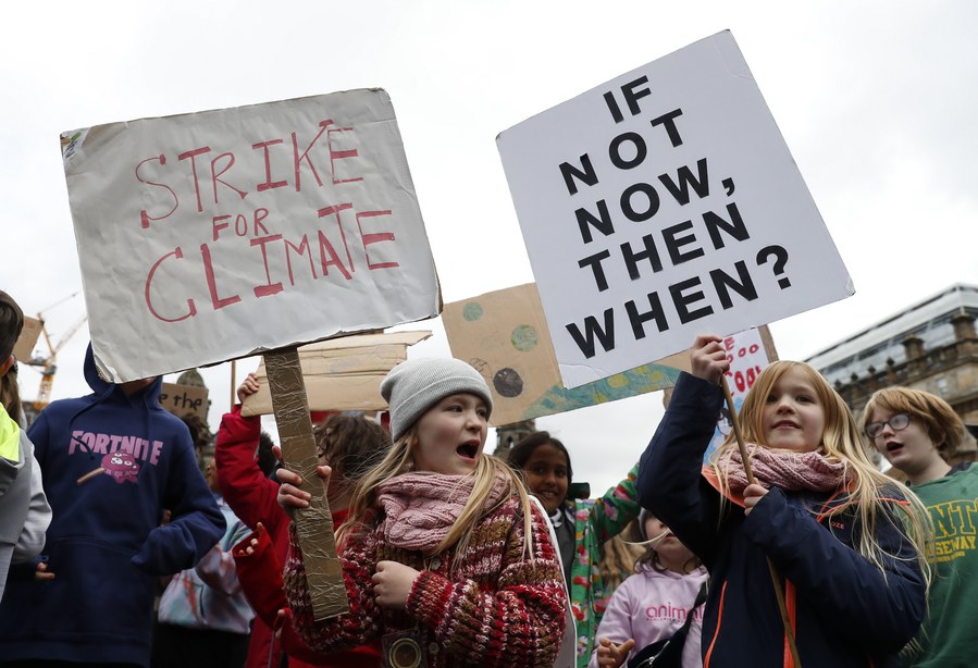 Children holding placards participate in a rally in Glasgow, Scotland, the United Kingdom, Nov. 5, 2021. (Xinhua/Han Yan)