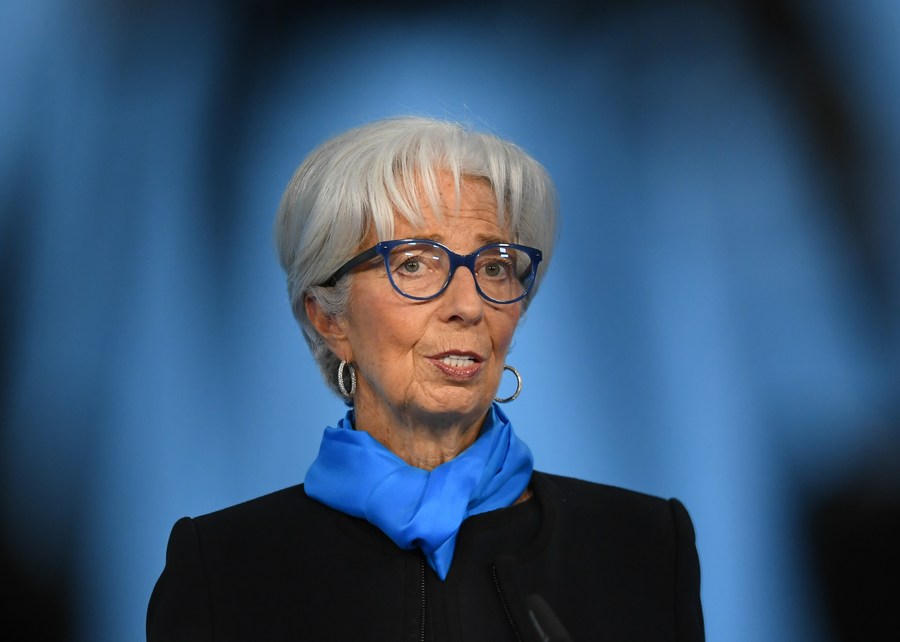 European Central Bank (ECB) President Christine Lagarde speaks during a press conference at the ECB headquarters in Frankfurt, Germany, Oct. 28, 2021. (Xinhua/Lu Yang)