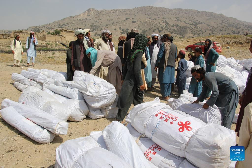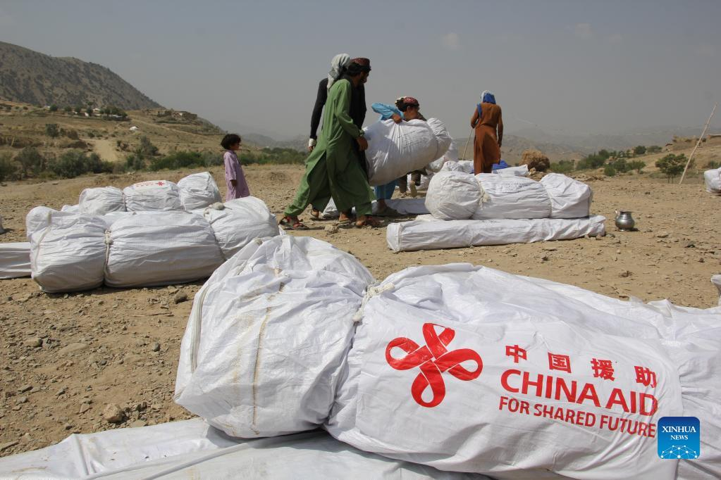 People receive China-donated quake relief supplies in Paktika province, Afghanistan, on July 2, 2022. (Photo by Sabwoon/Xinhua)