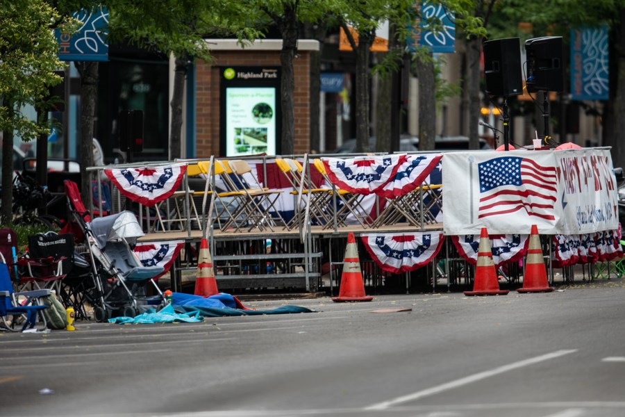 The VIP grandstand of the Independence Day parade sit empty after a mass shooting in Highland Park, Illinois, the United States, July 4, 2022. (Photo by Vincent Johnson/Xinhua)
