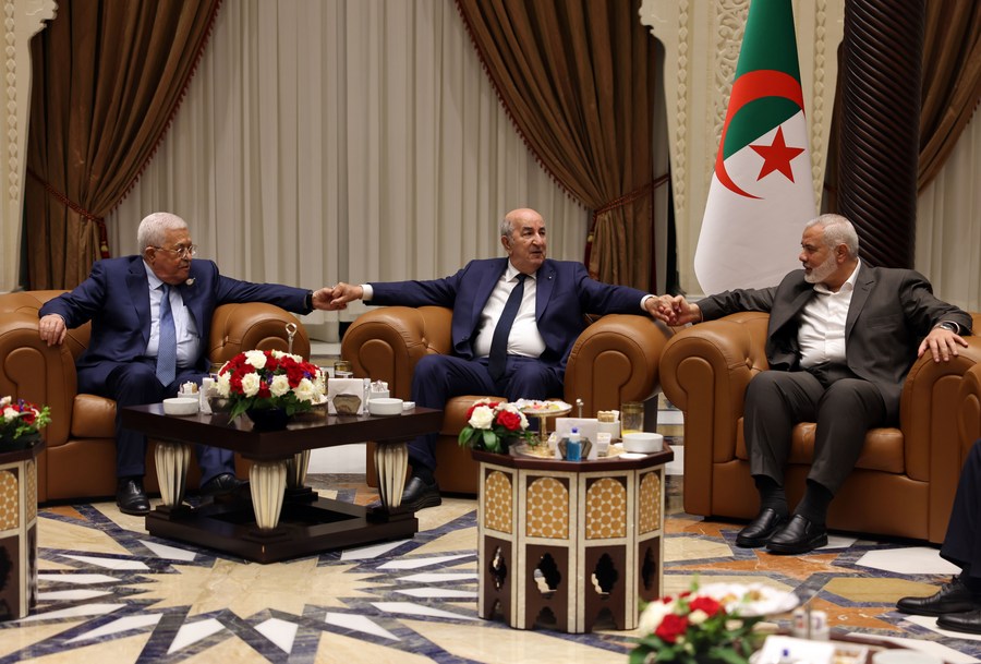 A photo released by the Palestinian presidency showed Algerian President Abdelmadjid Tebboune sitting between Abbas and Haniyeh in a meeting room with Algeria's green-and-white national flag in the background.