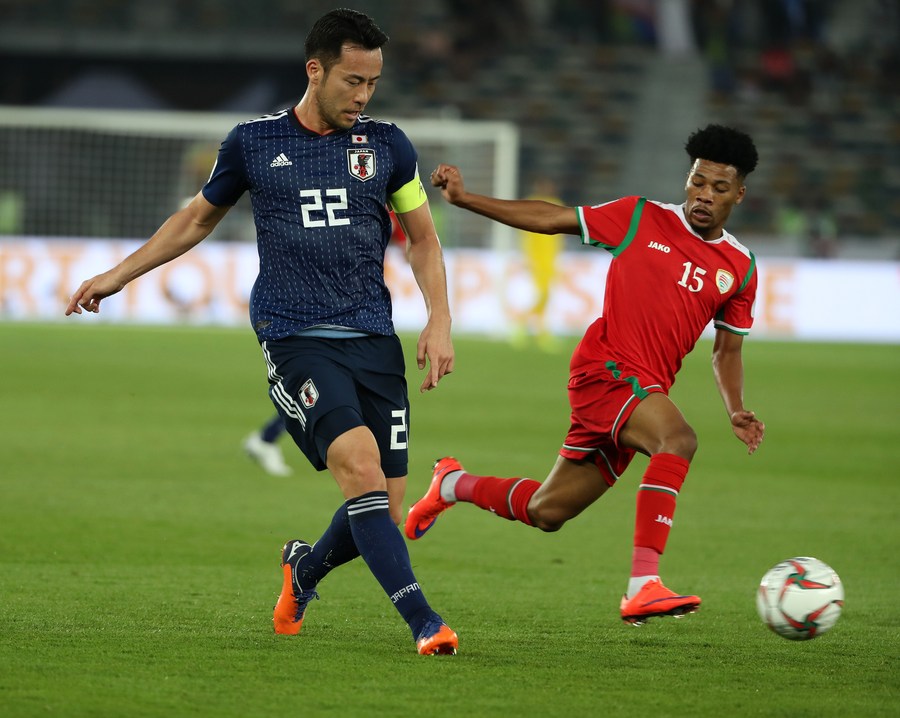 Maya Yoshida (L) of Japan vies with Jameel Al Yahmadi of Oman during the 2019 AFC Asian Cup UAE 2019 group F match between Oman and Japan in Abu Dhabi, the United Arab Emirates (UAE), on Jan. 13, 2019. (Xinhua/Li Gang)