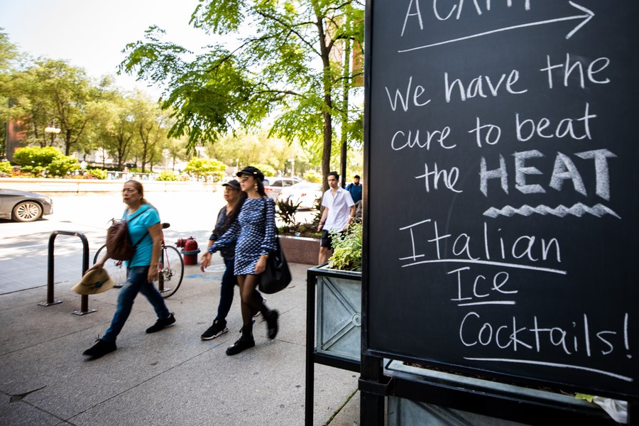 A restaurant advertises cold drinks on a chalkboard by its door in downtown Chicago, the United States, on June 14, 2022. (Photo by Vincent D. Johnson/Xinhua)
