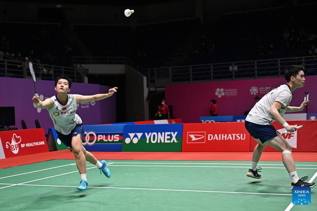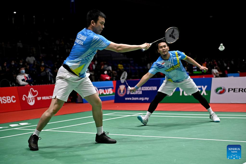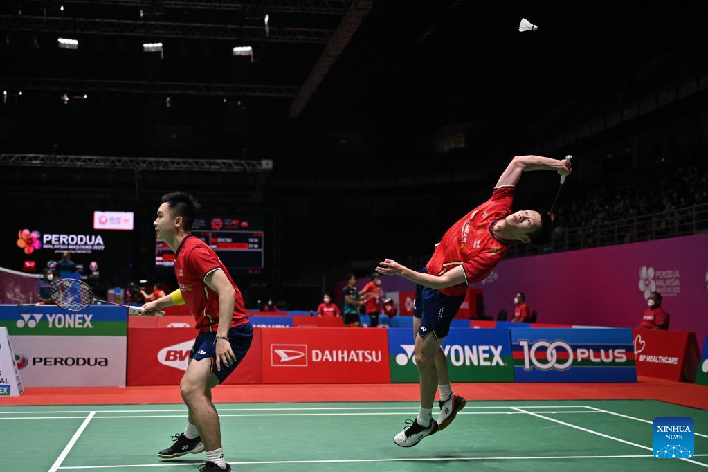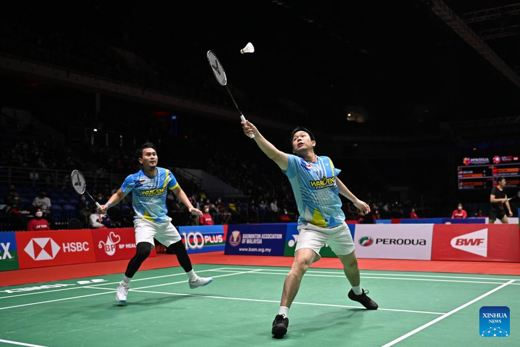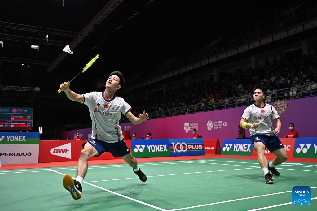 China's Ren Xiangyu(R)/Tan Qiang compete during the men's doubles round of 16 match against Indonesia's Mohammad Ahsan/Hendra Setiawan at Malaysia Masters 2022 in Kuala Lumpur, Malaysia, July 7, 2022. (Photo by Chong Voon Chung/Xinhua)