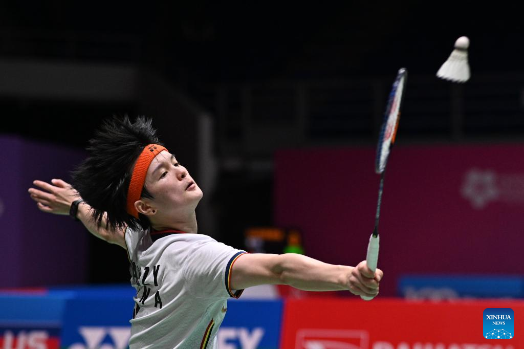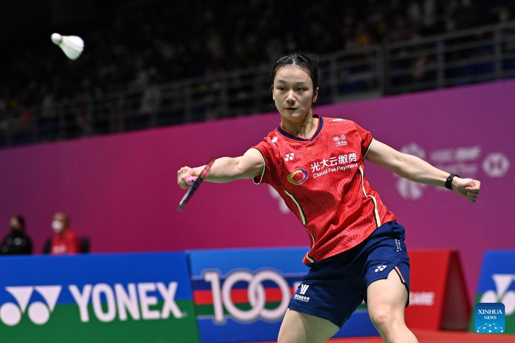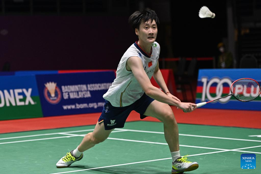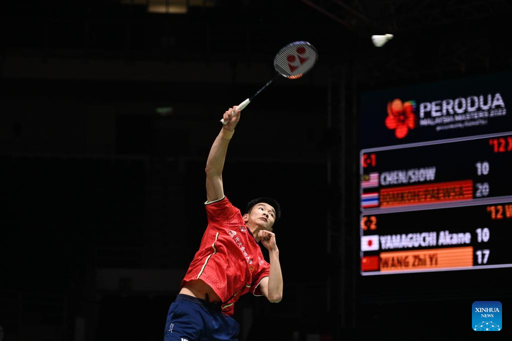 China's Wang Zhiyi hits a return during the women's singles round of 16 match against Japan's Akane Yamaguchi at Malaysia Masters 2022 in Kuala Lumpur, Malaysia, July 7, 2022. (Photo by Chong Voon Chung/Xinhua)
