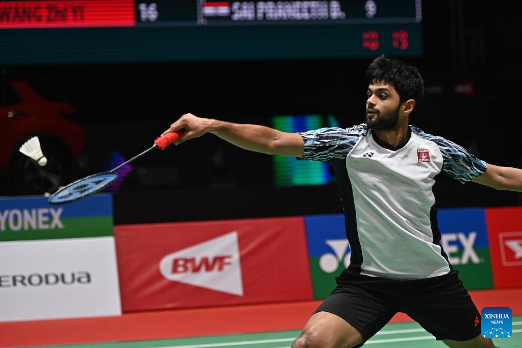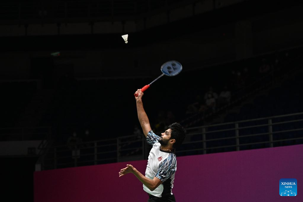 India's Sai Praneeth B. hits a return during the men's singles round of 16 match against China's Li Shifeng at Malaysia Masters 2022 in Kuala Lumpur, Malaysia, July 7, 2022. (Photo by Chong Voon Chung/Xinhua)