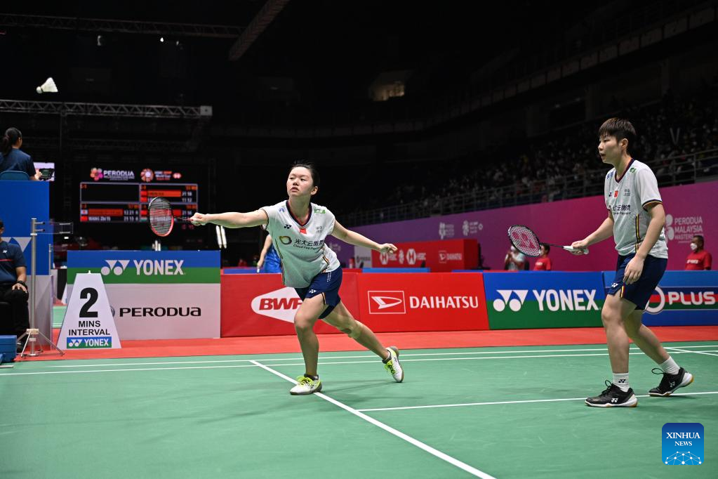 China's Liu Xuanxuan/Xia Yuting (L) compete during the women's doubles round of 16 match against their teammates Chen Qingchen/Jia Yifan at Malaysia Masters 2022 in Kuala Lumpur, Malaysia, July 7, 2022. (Photo by Chong Voon Chung/Xinhua)