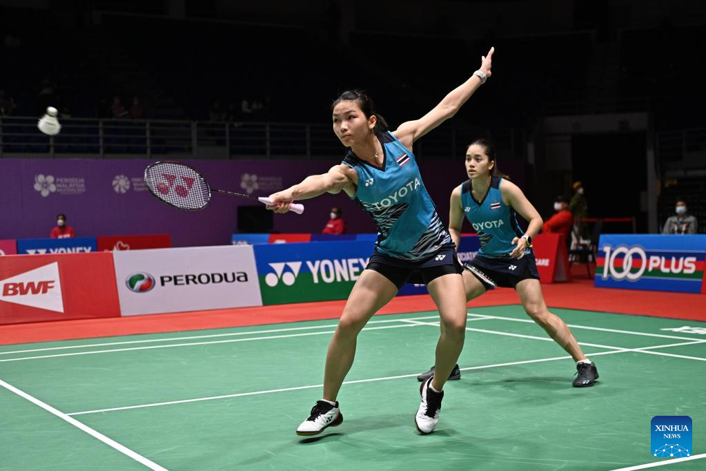 Thailand's Jongkolphan Kititharakul(L)/Rawinda Prajongjai compete during the women's doubles round of 16 match against China's Du Yue/Li Wenmei at Malaysia Masters 2022 in Kuala Lumpur, Malaysia, July 7, 2022. (Photo by Chong Voon Chung/Xinhua)