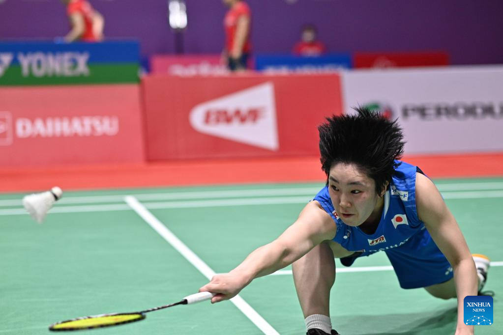 Japan's Akane Yamaguchi hits a return during the women's singles round of 16 match against China's Wang Zhiyi at Malaysia Masters 2022 in Kuala Lumpur, Malaysia, July 7, 2022. (Photo by Chong Voon Chung/Xinhua)