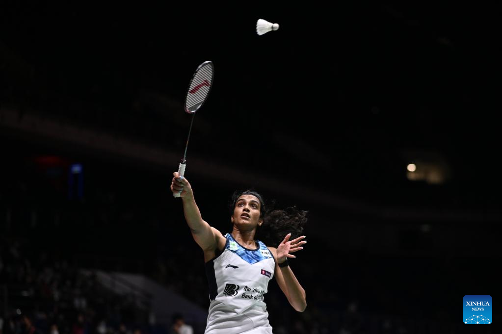 India's Pusarla V.Sindhu hits a return during the women's singles round of 16 match against China's Zhang Yiman at Malaysia Masters 2022 in Kuala Lumpur, Malaysia, July 7, 2022. (Photo by Chong Voon Chung/Xinhua)