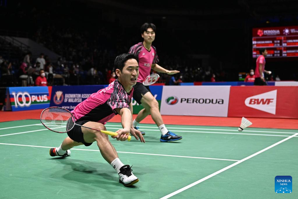 South Korea's Choi Sol Gyu (L) / Kim Won Ho compete during the men's doubles round of 16 match against China's Liang Weikeng/ Wang Chang at Malaysia Masters 2022 in Kuala Lumpur, Malaysia, July 7, 2022. (Photo by Chong Voon Chung/Xinhua)