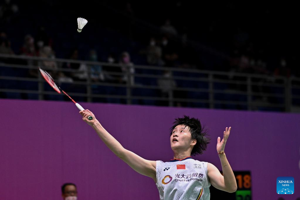 China's Chen Yufei competes during the women's singles round of 16 match against Thailand's Pornpawee Chochuwong at Malaysia Masters 2022 in Kuala Lumpur, Malaysia, July 7, 2022. (Photo by Chong Voon Chung/Xinhua)