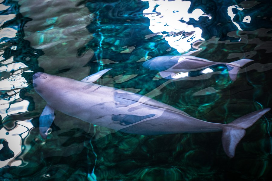 Yangtze finless porpoise F9C22 swims with its mother in the water at the Institute of Hydrobiology (IHB) of Chinese Academy of Sciences in Wuhan, central China's Hubei Province, June 29, 2022. (Xinhua/Xiao Yijiu)
